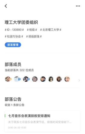 部落群:团学组织部落群,组织服务第二课堂,形成活动记录。