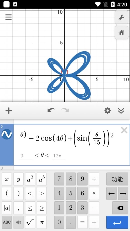 要用到字母输入模式里的θ。如果不用θ,而是其它字母,会被视为非极坐标方程。r=sin(θ)的图像是圆,与x轴切于原点;r=sin(x)或者r=sin(u)代表正弦曲线。