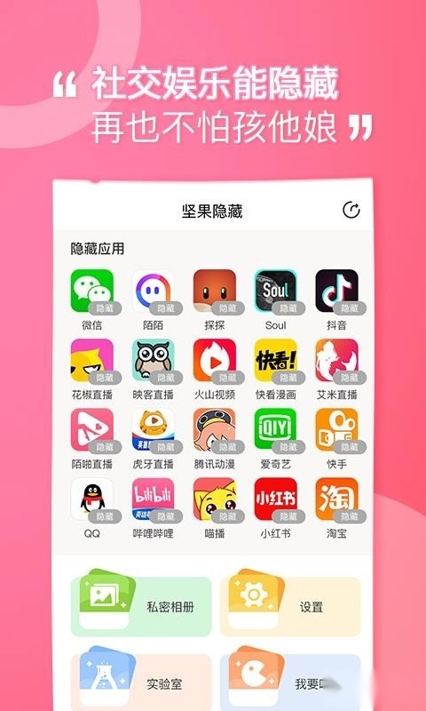 坚果隐藏是深圳市前海快付数据服务有限公司开发的隐私保护工具平台,核心功能是通过真实的应用隐藏与伪装服务,帮助用户隐藏手机中不愿被他人看到的软件图标——将这些应用伪装成各类普通实用工具,只有输入正确密码或按特定点击顺序,才能打开真实应用,让隐藏效果更显真实。此外,该工具还具备应用双开功能,可为常用的社交、游戏类应用创建独立分身,支持用户同时登录两个账号,便于清晰区分工作与生活场景。