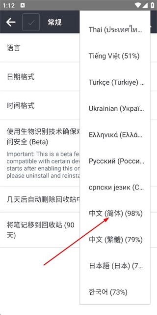 在语言列表中选择目标语言中文,完成语言设置。