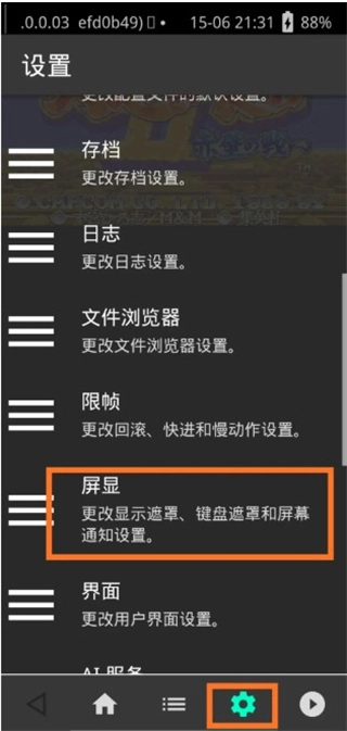 手机启动RetroArch后运行一款游戏,打开菜单界面,选择齿轮形状的设置图标,找到“屏显”选项并点击。