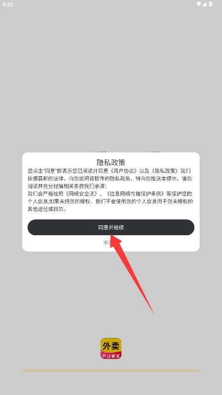 首次使用时,请仔细阅读平台的服务条款和隐私政策,确认无误后,点击“同意并继续”按钮即可进入应用。