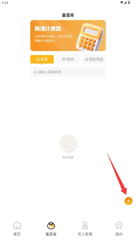 进入备菜库管理模块后,点击右下角的加号按钮添加菜品,点击该按钮即可开始创建新菜谱。