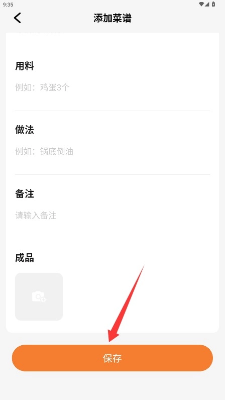 完善菜品的相关资料,涵盖名称、食材配料、烹饪方法等内容,上传菜品成品照片后将记录保存下来。