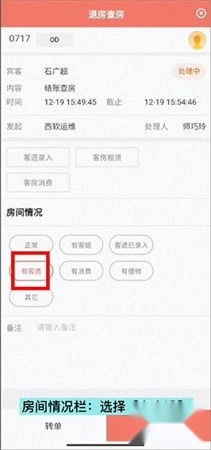 依据房间的实际状况,若察觉到有客人遗落的物品,烦请选取“有客遗”这一选项,并且迅速提交查房相关信息。
