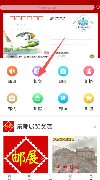 在首页找到并点击“邮文”。