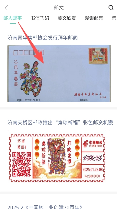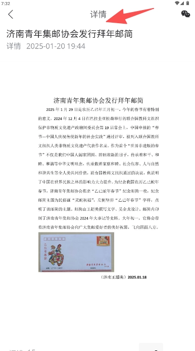 在浏览内容时,点击“济南青年集邮协会发行拜年邮简”这一文章标题即可进入。