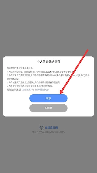 打开幸福海员通应用后,会弹出个人信息保护指引的窗口。仔细阅读其中关于设备权限、信息收集等方面的条款,确认无误后点击同意,即可进入应用的主界面。
