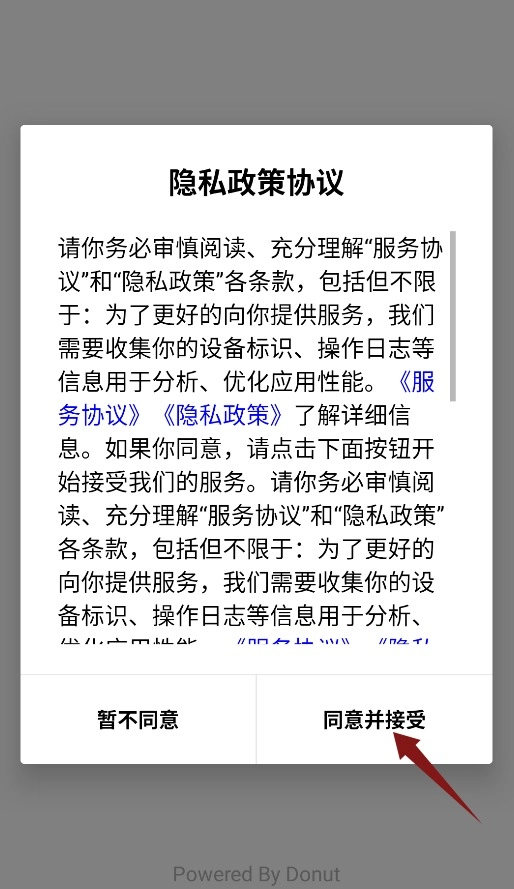 首次打开应用时,需要点击确认协议的弹窗并同意协议,才能进入主界面。