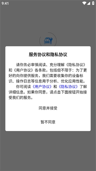 首次使用时,请先仔细阅读并同意用户协议和隐私政策,之后点击“接受”按钮即可进入应用。