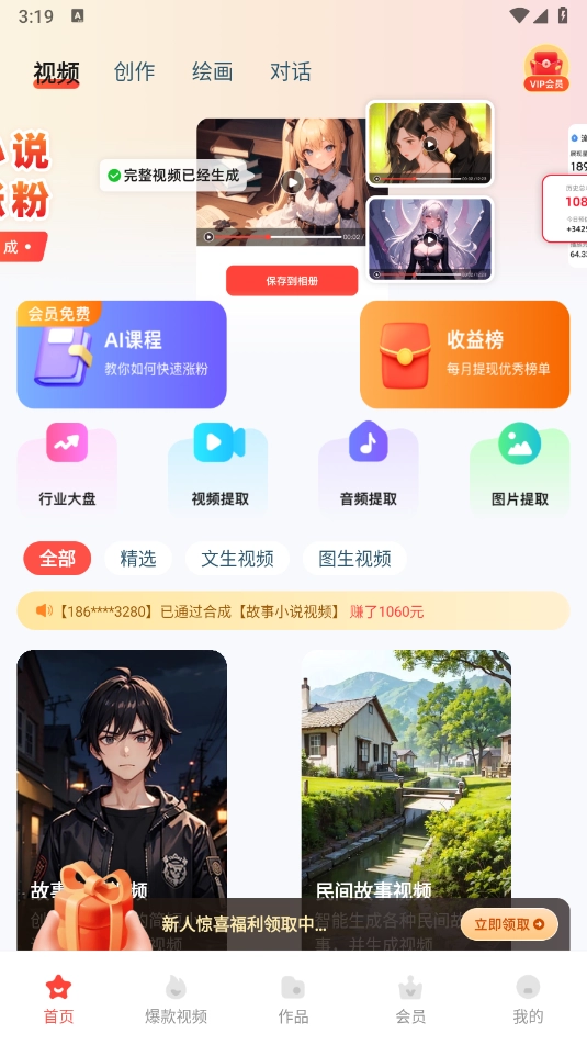 进入软件,包含了创作、绘画以及对话等板块。