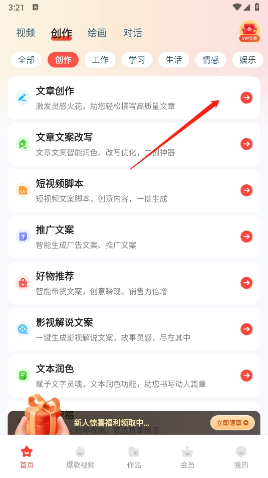 例如小编薛泽的“创作”版块,挑选要开展创作的功能。