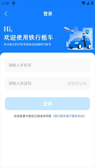 在本站安装并打开铁行租车应用,进入后前往注册登录界面。