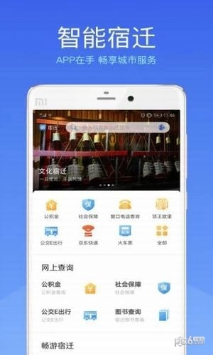 依托宿迁政府提供的资源,为宿迁市民提供办事服务、交通出行、社保查询等多种城市生活服务。