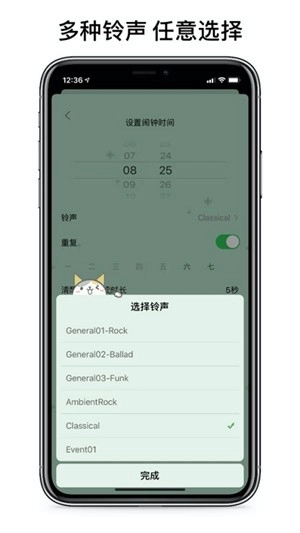 设置闹钟的步骤很简单,本地铃声能自由调整,重复周期也可以完全按照自己的需求来设定呢!