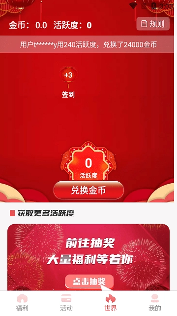 打开软件就能看到福利、活动、世界和我的个人中心,每个人都可以去抽奖哦!