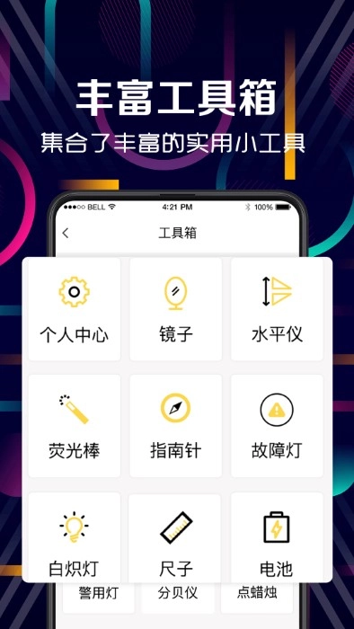 手电筒免费是一款体验出色的小工具聚合软件,为用户提供各类高品质小工具,其中手电筒功能尤为强大,还能制作多种色彩绚丽的跑马灯效果,帮助用户快速找到所需工具。