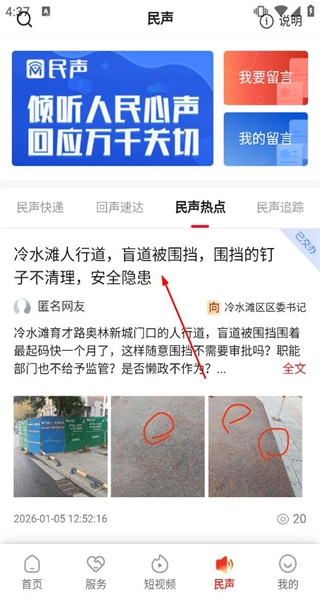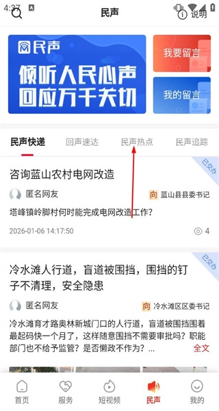 进入民声页面后,找到并点击“民声热点”选项,切换到对应的板块,就能看到其他用户发布的各类民生问题留言。