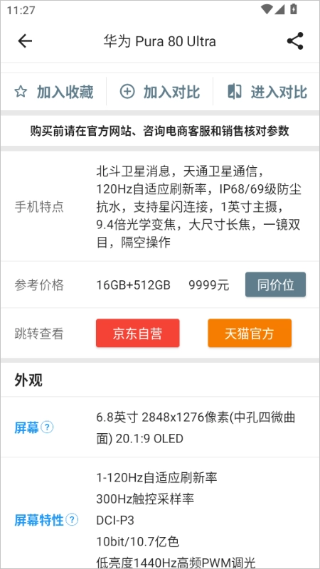 用户能够在JD.COM自营以及天猫商城里快速查询到标准配置的价格。这一功能不仅可以让用户了解市场动态,还能让用户及时收到降价通知,从而帮助用户用最优惠的价格购买到想要的手机。
