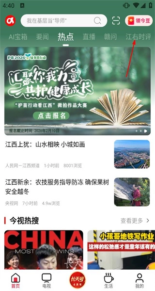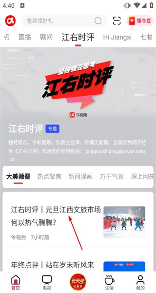 打开应用首页后,找到“江右时评”选项并点击进入该板块页面,即可查看相关的评论类内容。