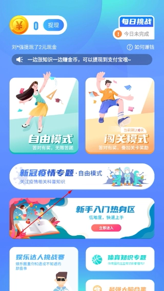 进入首页就能看到【提现】按钮,有【自由模式】和【闯关模式】两种答题模式可供选择,新手可以进入【新手入门热身区】熟悉操作,通过答题就能赚取现金并进行提现。