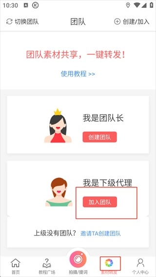 进入首页后,找到页面最下方的【素材转发】按钮并点击,接着点击中间位置的【加入团队】按钮。