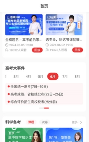 向下滑动页面,还能看到各类志愿直播间、高考大事件、科学备考课程以及志愿讲堂等内容,助力用户找到自己所需的信息。