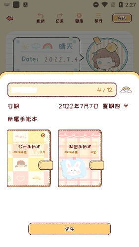 完成所有DIY操作后,我们点击保存按钮,就能把内容存入自己创建的手账本里了。
