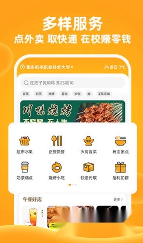 【周边商户】橙子校园对高校校内及周边的商户进行整合与规范,旨在降低商户的运营成本,同时让学生享受到更便利、安全且实惠的生活服务。