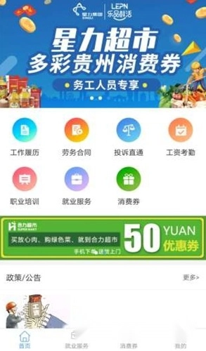 进入首页后,可选择工作履历、劳务合同、政策公告等专区进行浏览。