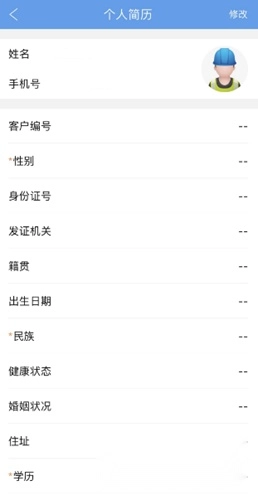打开智慧劳务应用,进入“我的”功能界面后,找到并点击“个人简历”选项。