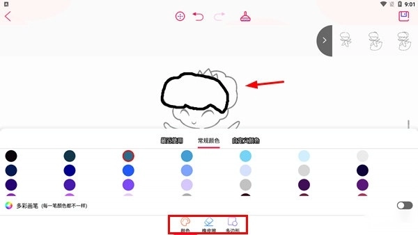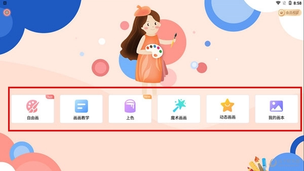 一、打开画图软件后,能看到自由画、画画教学、上色、魔术画画、动态画画、我的画本这六个基础模块。其中,【上色】模块可实现图片的快速上色,用户创作的所有图画则会统一保存在【我的画】中。