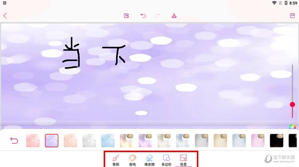 二、点击【自由画】选项,用户即可在此进行自由创作,还能在下方对笔刷样式、色彩选择以及背景设置等进行调整。