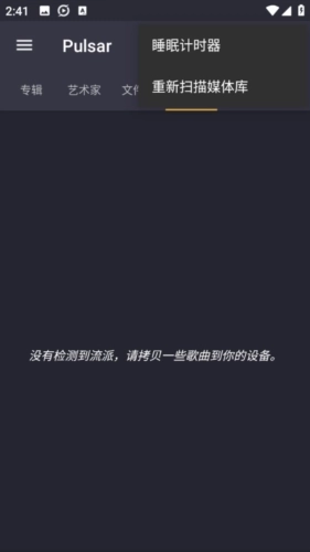 Pulsar支持mp3、aac、flac、ogg、wav等标准音乐文件类型。要是您在Pulsar里没找到自己的音乐,可点击操作栏中的“重新扫描库”选项来重新扫描设备。
