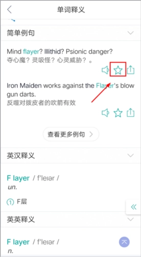 在内搜索查询到的生词,可点击右上角的“☆”添加至“我的生词本”中。