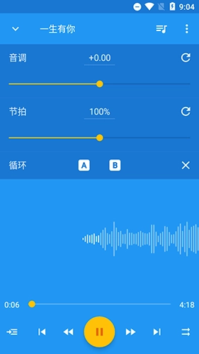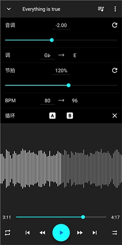 调整音调——可将歌曲的音调升高或降低24个半音,支持输入带小数的半音数值。