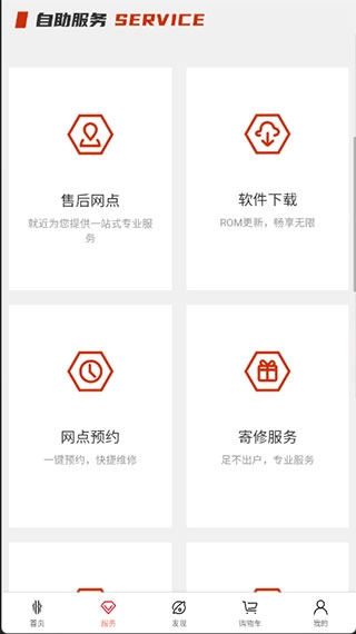 点击“服务”选项,就能查看各类售后服务内容,其中涵盖售后网点以及ROM等自助服务项目。