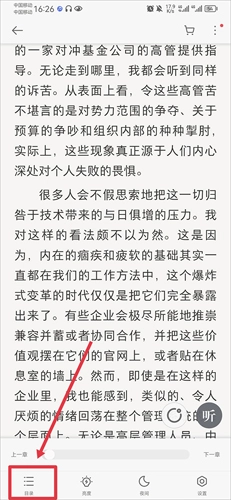 若处于阅读界面,可点击屏幕,随后在弹出的菜单栏目里点击左下角的目录。