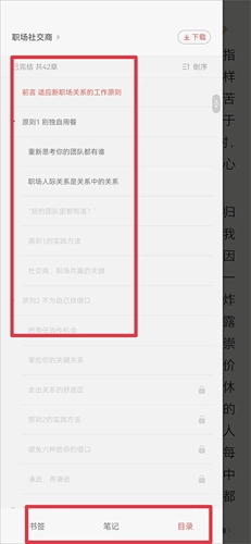 然后就能看到整本书里所有的章节目录了,而且你还可以查看自己标记的书签和笔记目录。