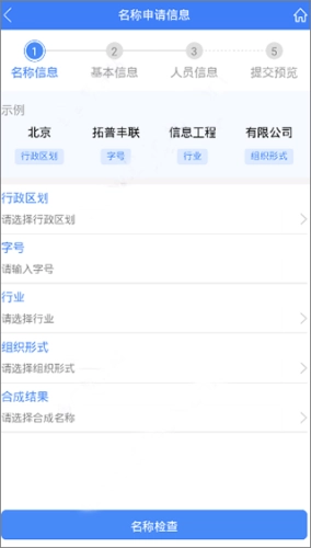 打开工商系统,登录账号后选择名称登记选项,进入如下面图示的名称申请页面。