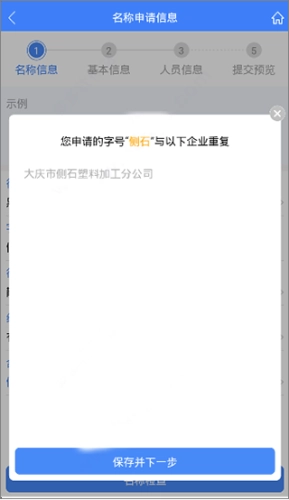 选好企业名称后,点击“名称检查”按钮,系统会显示相关检查结果(见下图)。若名称可用,就点击“保存并下一步”,进入“名称基本信息”页面。