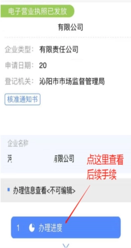 若系统提示“电子营业执照已发放”,那就意味着您可以前往登记窗口领取纸质营业执照啦!点击公司名称,就能看到后续需要办理的各项手续,请务必仔细查看(具体操作界面可参考下方图示)。