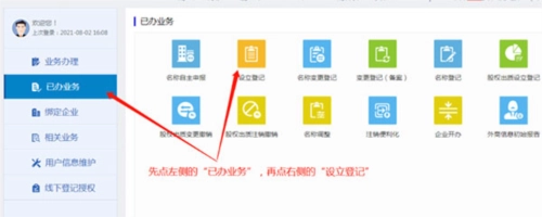 要是在前面的步骤里没找到您提交的业务,那很可能是已经通过了,您可以点击页面左边的“已办业务”,接着点击右边的“设立登记”(操作界面可参考下图)