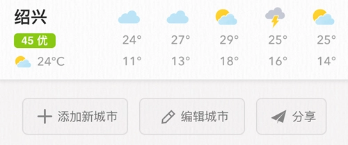然后你们点击最下方的【我的】,就能看到所有添加过的城市天气了,这样就不用在首页来回滑动,直接在这里查看就行。你们还可以继续添加新城市,这是个很方便的功能。