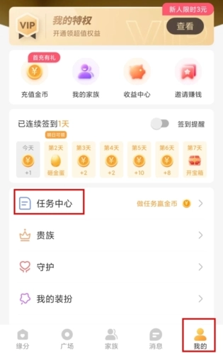 在我的页面中点击任务中心按钮。