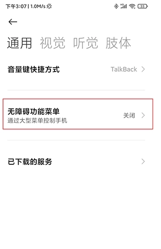 2、点击“辅助功能权限”后,找到“无障碍功能菜单”,是默认关闭的,需要开启;