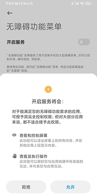 3、点击允许开启无障碍功能菜单;