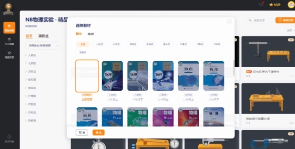 NOBOOK虚拟实验包含很多精品资源,也支持众多实验模块的自主探究,例如物理学科的力,热,声、光、电与磁、家庭电路、近代物理、力与运动与受力分析这九大模块,化学学科的无机化学与电化学模块,都可以通过自由组装来完成实验的DIY探究。