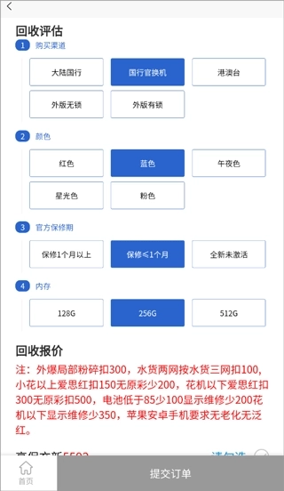 2、选择你的机型、购买渠道、颜色、保修期、以及内存等信息后,点击提交订单即可。