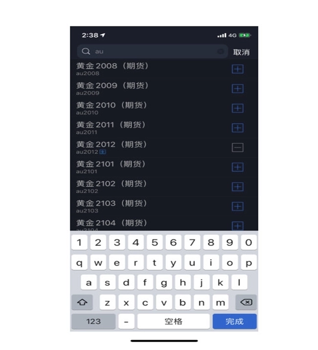 点击搜索 图标 ,进入搜索页面,在最上方的输入框输入品种/代码/首字母,软件下方就会显